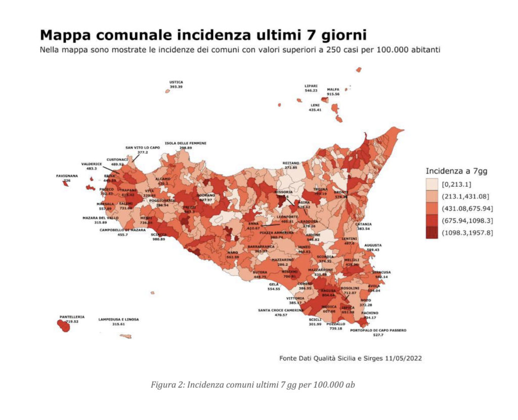 Nella settimana dal 2 all’8 maggio si registra un decremento delle nuove infezioni. L’incidenza di nuovi positivi, è pari a 23.106 (-13.69%), con un valore cumulativo di 478,02/100.000 abitanti. Il tasso di nuovi casi più elevato rispetto alla media regionale si è registrato nelle province di Siracusa (573/100.000 abitanti) e Messina (558/100.000).