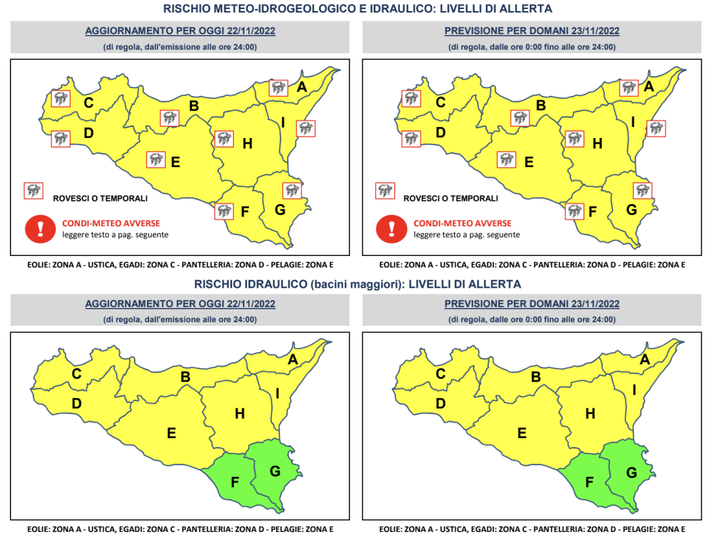 Prosegue l’allerta gialla sulla Sicilia. La Protezione Civile Regionale ha pubblicato un avviso per il rischio meteo-idrogeologico ed idraulico, valido dalle 16 di oggi fino alle 24 di domani, mercoledì 23 novembre.