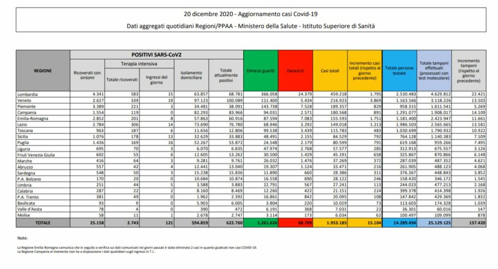 I ricoverati in ospedale con sintomi sono 25.158 (-206), 2.743 (-41) in terapia intensiva. I dimessi/guariti sono 1.261.626, con un incremento di 12.156 unità nelle ultime 24 ore. La regione con il maggior numero di nuovi casi è il Veneto (3.869), seguita da Lombardia (1.795), Emilia Romagna (1.751), Lazio (1.213) e Campania (891).