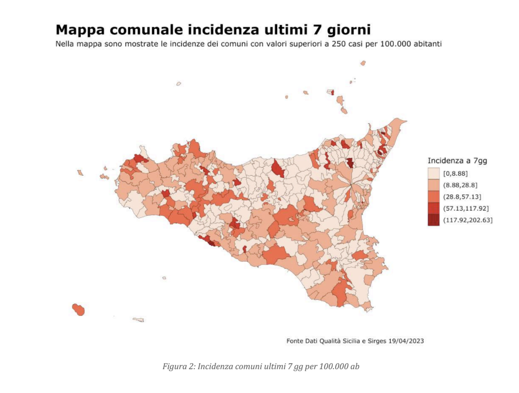 Nella settimana dal 10 al 16 aprile in Sicilia si è registrato un lieve aumento delle infezioni da Covid-19, in linea con la tendenza sul territorio nazionale. I nuovi positivi sono stati 874, ovvero il 32,42% in più rispetto alla settimana precedente, con un’incidenza di 18 per 100 mila abitanti. Il tasso più elevato rispetto alla media regionale si è registrato nelle province di Palermo (24/100.000), Messina (21/100.000) e Agrigento (20/100.000). I dati sono riportati all’interno del bollettino settimanale a cura del Dasoe, il dipartimento per le Attività sanitarie e osservatorio epidemiologico dell’assessorato per la Salute della Regione Siciliana.