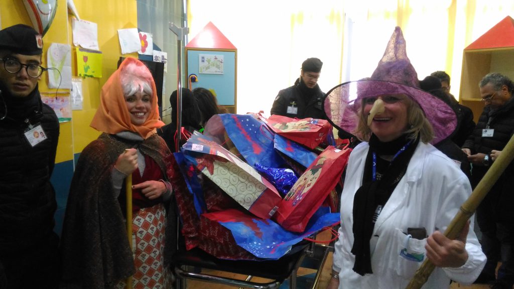 Sopra ha trovato la Befana “due” e insieme hanno iniziato il giro per la distribuzione dei giocattoli offerti dall’Associazione Sicilia Eventi. Insieme a loro gli “amici cani” del Nucleo Cinofilo del Comando dei Vigili del Fuoco, i volontari dell’Associazione Regalami un Sorriso e delle Associazioni di Protezione Civile SanMarco e Aopcs Sicilia. Il tour è partito dalla ludoteca di Pediatria ed è poi proseguito al Pronto soccorso pediatrico e a Ortopedia pediatrica, fra lo sguardo incredulo e contento dei bambini. Insieme al Commissario Aricò e al Direttore Sanitario Pietro Greco, tanti medici e operatori e il deputato regionale Vincenzo Figuccia, con la sorella Sabrina, consigliere comunale. L’evento è stato organizzato dal Servizio Educazione alla Salute, responsabile il dr. Salvatore Siciliano.