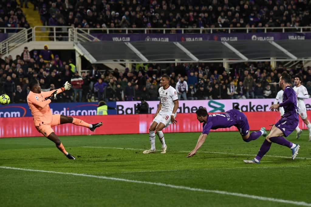 Terracciano effettua nei 45′ iniziali una sola parata, quella su Giroud servito da Messias al 32′. Ben altra musica nella ripresa quando il portiere viola salva almeno due volte il vantaggio della Fiorentina, prima su Giroud poi su Theo Hernandez, vantaggio dei padroni di casa arrivato grazie ad un rigore realizzato da Nico Gonzalez, e correttamente assegnato da Di Bello per spinta in area di Tomori ai danni di Ikonè. Dopo 65′ Pioli insoddisfatto decide di stravolgere il suo Milan operando tre cambi contemporaneamente: fuori Giroud, Rebic e Bennacer per Ibrahimovic, Origi e Bakayoko. E’ un abbaglio colossale quello che prende Di Bello ad un quarto d’ora dalla fine quando fischia rigore per un colpo di testa di Cabral che per lui è un tocco di mano, l’intervento del Var fa chiarezza. La Fiorentina chiude la sfida a 3′ dalla fine con Jovic che raccoglie su cross di Dodo e batte Maignain, rete che manda in estasi il ‘Franchì. Nel finale Hernandez, a tempo ormai scaduto, segna ma non rovina la festa viola.