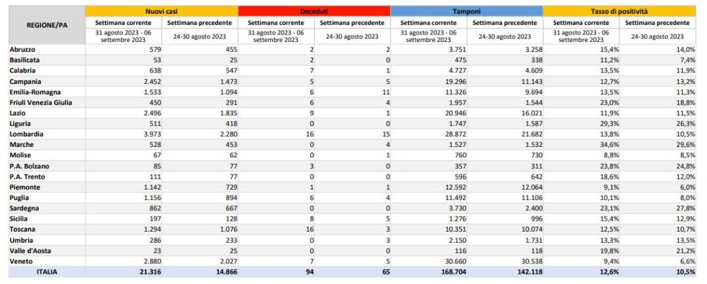 ROMA (ITALPRESS) – Aumentano i casi di Covid in Italia. Nell’ultima settimana, secondo quanto emerge dal bollettino diffuso dal ministero della Salute, i positivi sono stati 21.316, circa 6.500 in più del periodo 24-30 agosto. 94 i decessi, il tasso di positività è passato dal 10,5% al 12,6%.“L’attuale andamento clinico-epidemiologico non desta allarme, ma richiede attenzione e misure di prudenza – spiega il direttore Generale della Prevenzione Sanitaria del Ministero della Salute, Francesco Vaia -. Il Ministero, nell’interesse primario della tutela dei cittadini più fragili, si muove in una duplice direzione: da una parte misure di protezione e prevenzione per la tutela e sicurezza sia dei pazienti che degli operatori e dall’altra predisposizione di una campagna di vaccinazione annuale che punti a proteggere coloro che in passato sono stati più colpiti da Covid: anziani, fragili, immunocompromessi”.