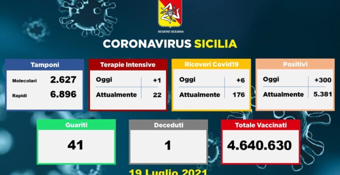 Coronavirus, dati della Sicilia del 19 luglio: 300 nuovi casi, 1 morto