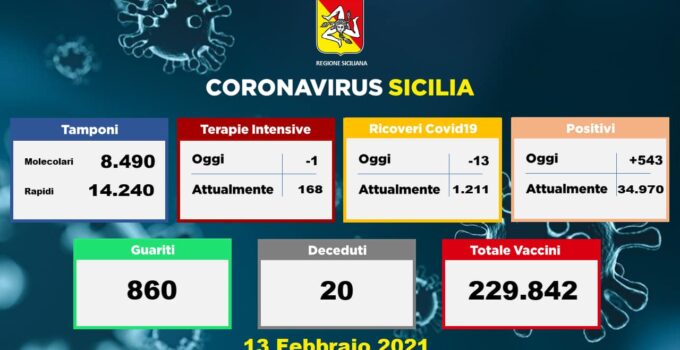 Coronavirus, dati della Sicilia del 13 febbraio: 543 nuovi casi, 20 morti