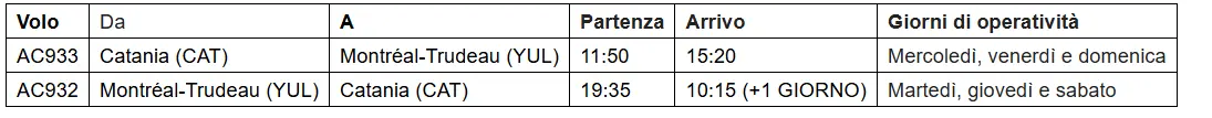 Il servizio stagionale opererà tre volte a settimana da Catania verso Montréal dal 5 giugno al 23 ottobre 2026, con il moderno Boeing 787 Dreamliner.