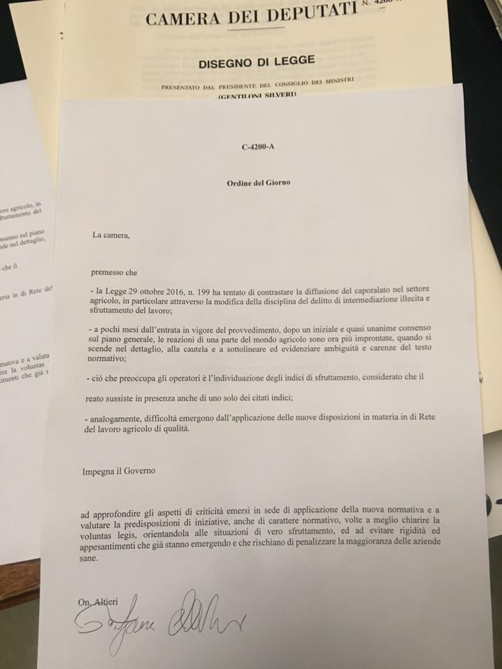 “Il Governo ha accolto, dopo una lunga battaglia, un mio ordine del giorno al DL Mezzogiorno, con cui chiedo di fare chiarezza sulla ratio della legge contro il caporalato modificando le norme che creano pericolose generalizzazioni e difficoltà per aziende che nulla hanno a che fare con questo fenomeno”. Lo dichiara il deputato pugliese Nuccio Altieri di Direzione Italia di Fitto.