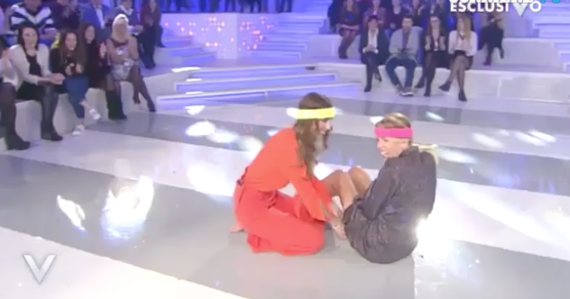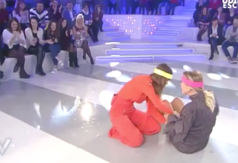 Mentre Alessia dava dimostrazione della sua flessibilità provando ad effettuare un esercizio ginnico è caduta addosso a Silvia Toffanin.