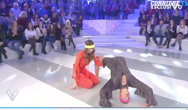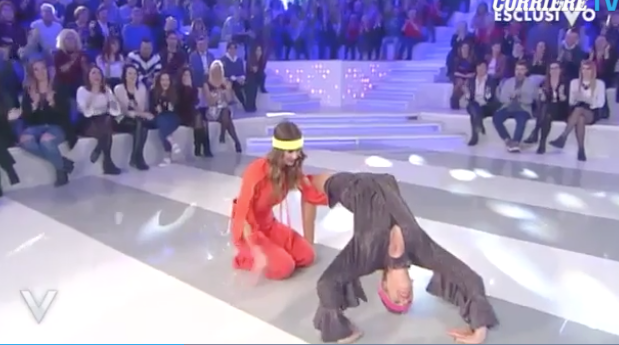 Proprio mentre Alessia faceva il ponte, Silvia Toffanin le teneva il vestito e tentava di infilarsi sotto l’arco creato da Alessia. Entrambe finisco a terra tra tra mille risate coinvolgendo il pibblico. “Un momento imperdibile della televisione italiana”, scherzano le due conduttrici.