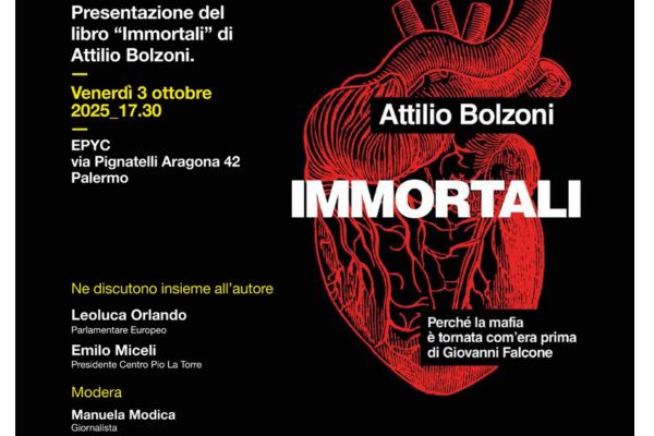 Sarà presentato alle 17.30 di venerdì 3 ottobre all’Epyc, in via Pignatelli Aragona 42, l’ultimo libro di Attilio Bolzoni dal titolo “Immortali” A parlarne, insieme all’autore, saranno Leoluca Orlando, parlamentare europeo, ed Emilio Miceli, presidente del Centro Studi Pio La Torre. Modera la giornalista Manuela Modica.