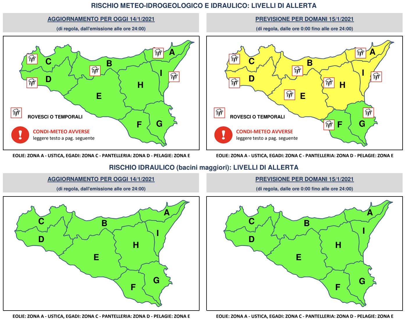 Il Dipartimento Regionale della Protezione Civile della Presidenza della Regione Siciliana ha diffuso un avviso per il rischio meteo-idrogeologico ed idraulico, valido fino alle 24 di domani, venerdì 15 gennaio.