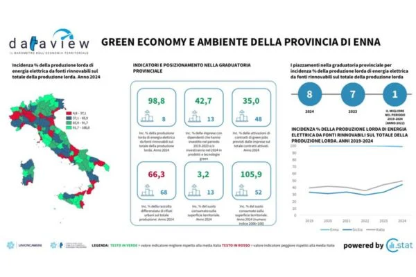 Produzione di energia da fonti rinnovabili, investimenti in tecnologie green, ‘green jobs’, raccolta differenziata, consumo di suolo. Dall’analisi realizzata da “Dataview”, il barometro dell’economia territoriale dell’Istituto “G. Tagliacarne” (con dati Ispra, Fondazione Symbola Unioncamere, Ministero del Lavoro) emerge che l’area della Città metropolitana di Palermo ha tre indicatori su 6 in segno positivo. Palermo e la sua provincia mostrano segnali efficaci sul fronte delle imprese con dipendenti che hanno investito tra il 2019 e il 2024 in prodotti e tecnologie green e presenta numeri confortanti sull’incidenza del suolo consumato sulla superficie territoriale, un parametro cruciale per monitorare l’impatto dell’urbanizzazione e promuovere politiche di tutela del territorio. Palermo e provincia restano indietro, invece, nel 2024 nella produzione lorda di energia elettrica da fonti rinnovabili sul totale della produzione lorda, nelle attivazioni di contratti di green jobs previsti dalle imprese sul totale contratti attivati e nella raccolta differenziata di rifiuti urbani sul totale produzione.