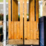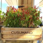 Una cassa di vini è stata trasformata in fioriera in cui troneggiano numerosi peperoncini. I fusti in acciaio della birra, ridipinti con colori vivaci, son diventati dei sedili.