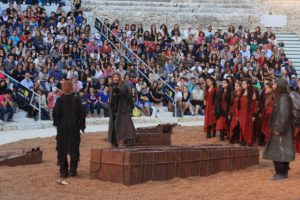 Il sole che tramonta abbassa le voci degli spettatori, si alza un vento caldo e la sabbia del palcoscenico si...