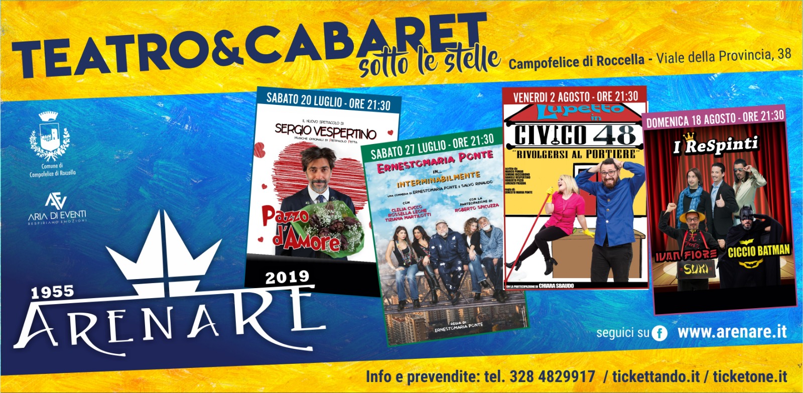 Si dà il via alla manifestazione sabato 20 luglio con “Pazzo d’Amore” il nuovo spettacolo di Sergio Vespertino, per poi proseguire sabato 27 luglio con “Interminabilmente” di Ernesto Maria Ponte con Clelia Cucco, Rossella Leone, Tiziana Martilotti e la partecipazione di Roberto Spicuzza, venerdì 2 agosto con “Civico 48” di Lupetto e, per terminare in bellezza, domenica 18 agosto i Renspinti, Ivan Fiore e Ciccio Batman di Sicilia Cabaret. Tutti gli spettacoli avranno inizio alle ore 21.30 e si terranno presso l’Arena Re di Campofelice di Roccella (PA).