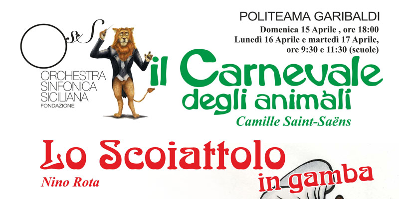 Debutto domenica 15 aprile alle ore 18 al Politeama Garibaldi per “Il Carnevale Degli Animali” di Camille Saint-Saëns e “Lo Scoiattolo in gamba” di Nino Rota, ultimi appuntamenti de La scuola a teatro. Sul podio, a dirigere l’Orchestra Giovanile Siciliana, Ottavio Marino, regia di Silvia Alù. In scena circa 150 artisti.