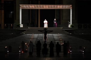 ROMA (ITALPRESS) - Una piazza San Pietro vuota, il percorso in cui si disegna la Via Crucis segnato da fiaccole...