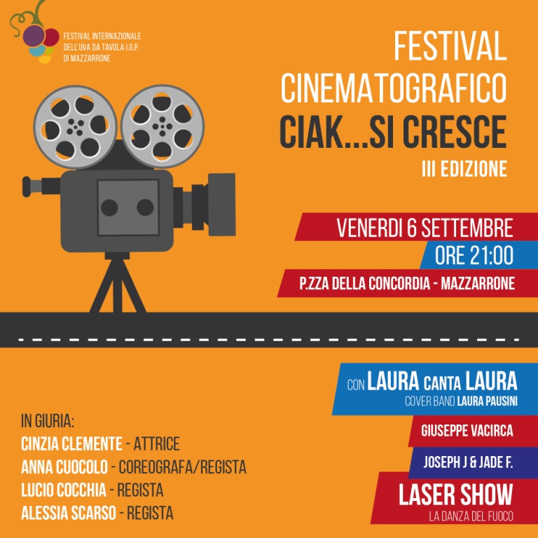 Ciak Si Cresce. Venerdì 6 Settembre, ad aprire i festeggiamenti del Festival dell’Uva da Tavola I.G.P. di Mazzarrone, sarà la terza edizione del Festival Cinematografico “Ciak Si Cresce”. Il Festival, come da tradizione, chiude il percorso formativo avviato con giovani talenti, dai quattordici ai diciassette anni, con la proiezione dei cortometraggi da loro prodotti e l’assegnazione dei vari premi. Quest’anno, ad assegnarli, una giuria d’eccezione proveniente dal panorama cinematografico e televisivo nazionale.