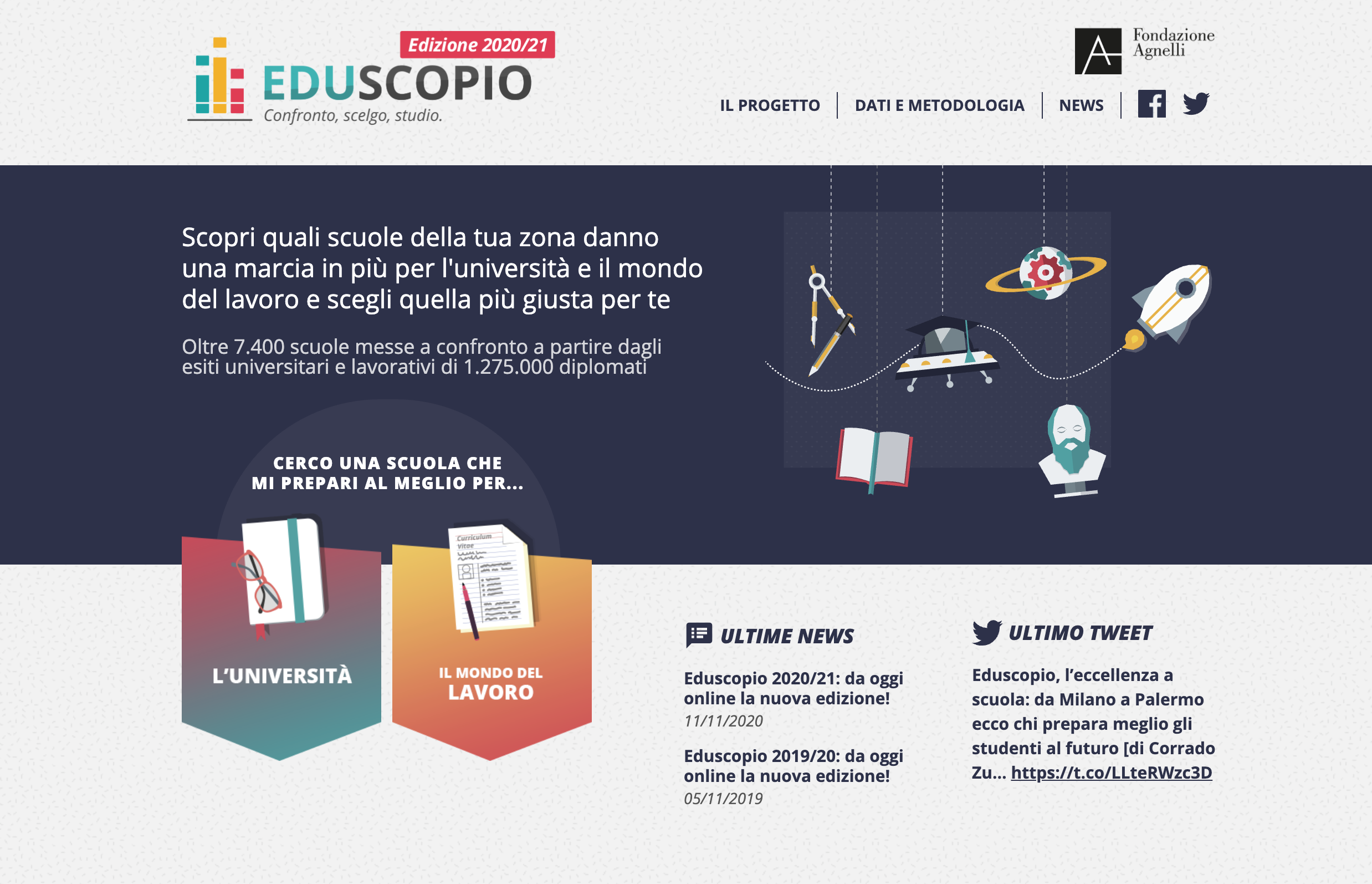 In un anno in cui la pandemia ha tolto la possibilità agli studenti delle scuole medie di scegliere l’indirizzo superiore attraverso gli open day, arriva in aiuto la classifica annuale di Eduscopio 2020 della Fondazione Agnelli (www.eduscopio.it), il portale, nato nel 2014 e gratuito, che si propone di aiutare gli studenti nel momento della scelta della scuola dopo la terza media.