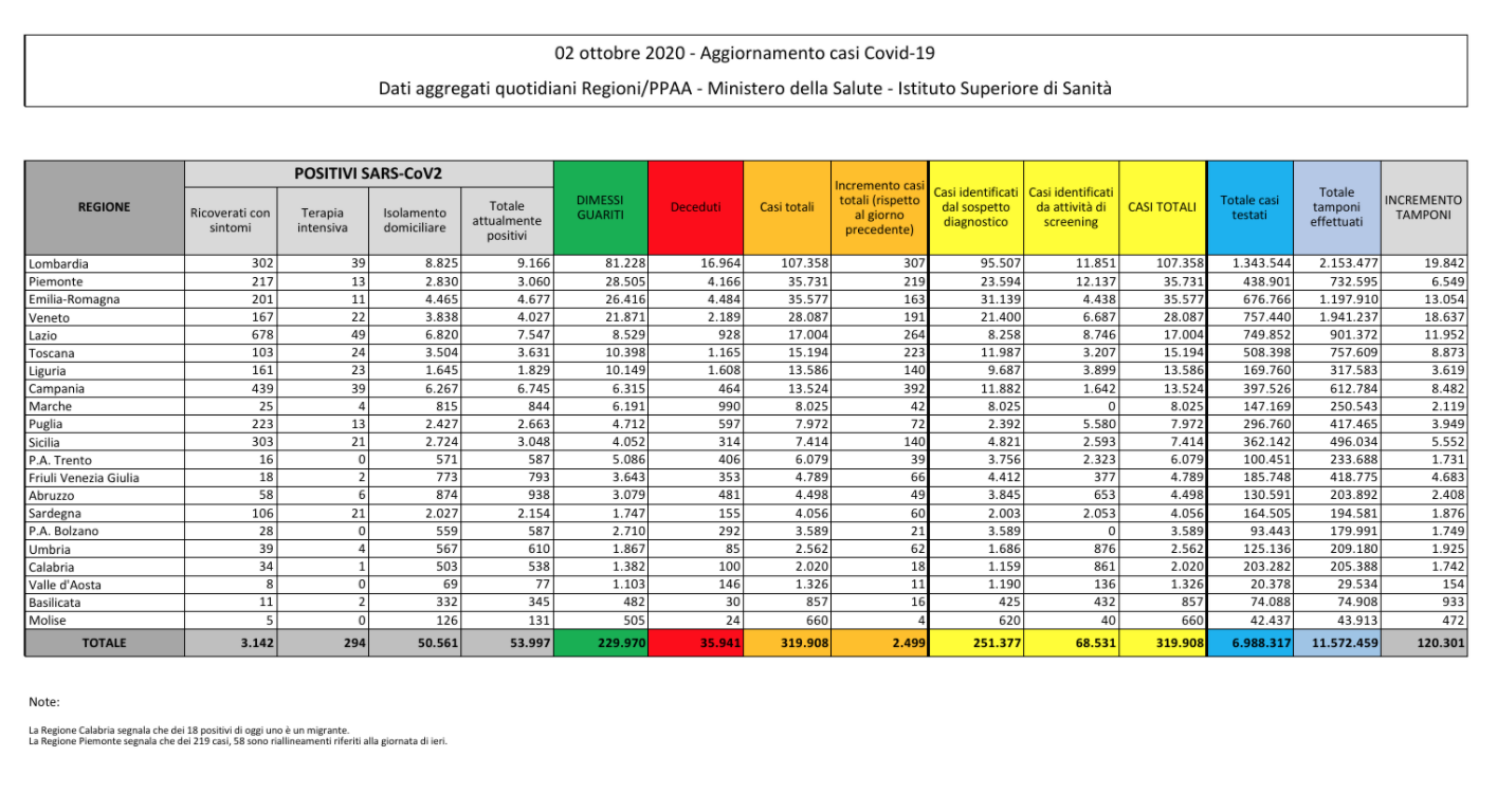 CORONAVIRUS, I DATI DEL BOLLETTINO NAZIONALE