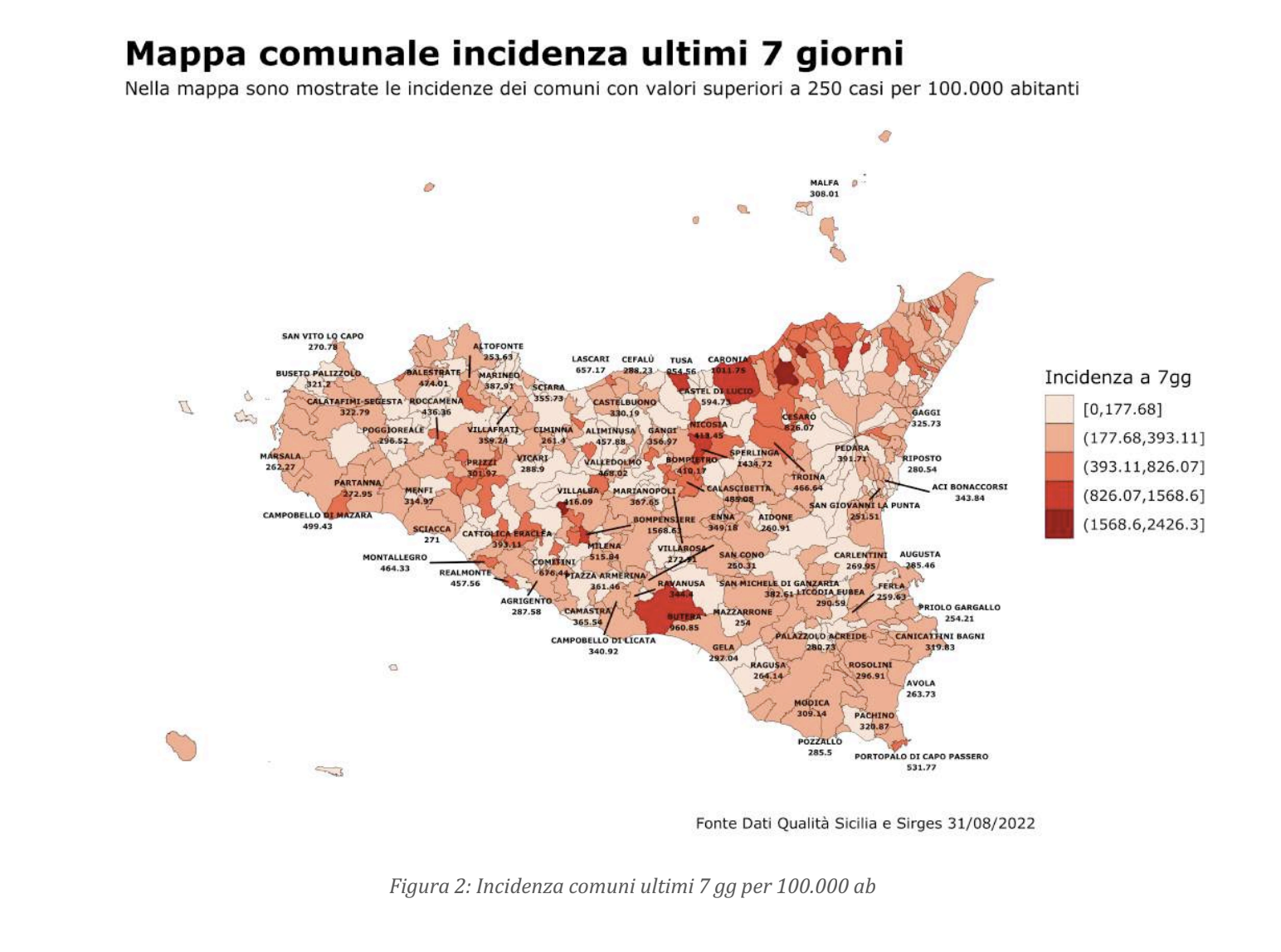 Nella settimana dal 22 al 28 agosto si registra un decremento dei nuovi casi con un’incidenza pari a 10.747 (-7%) e un valore cumulativo di 224/100.000 abitanti. Il tasso di nuovi positivi più elevato rispetto alla media regionale si è registrato nelle province di Messina (339/100.000 abitanti), Siracusa (248/100.000), Trapani (247/100.000) e Agrigento (232/100.000). Le fasce d’età maggiormente a rischio risultano quelle tra i 70 e i 79 anni (297/100.000 abitanti) e tra i 60 e i 69 anni (277/100.000). Anche le nuove ospedalizzazioni sono in lieve diminuzione.