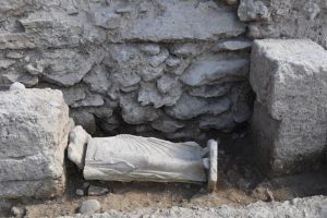 Una figura femminile in posa incedente, abbigliata con chitone e himation, priva della parte superiore del torso e della testa....