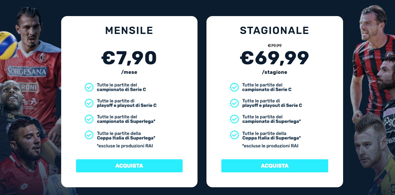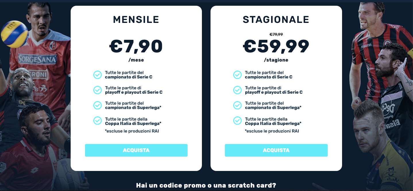 NOTA: l’abbonamento a Eleven Sports (oltre alle partite del campionato di Serie C – playoff e playout compresi) include tutte le partite della Superlega, il massimo campionato di pallavolo maschile.
