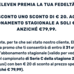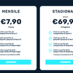 Scontati invece i prezzi per gli utenti già registrati e già abbonati nella scorsa stagione: una volta effettuato l’accesso sul sito potranno visualizzare delle offerte, come quella al prezzo di 59,99 euro per chi ha attivato un “mensile” nella scorsa stagione, mentre chi si è abbonato per tutta la scorsa stagione (abbonamento stagionale), ha diritto a un ulteriore sconto e il prezzo così scende a 49,99 euro (IN GALLERY il riepilogo delle info).