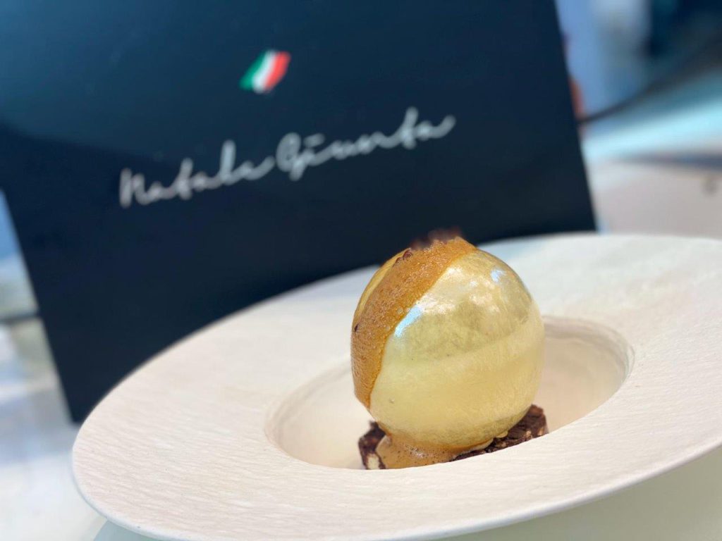 Tutti lo amano, tutti lo reclamano, il tiramisù è il dolce italiano per eccellenza, c’è chi dice che sia di origini romane, altri laziali, non c’è tavola italiana in patria e all’estero che non lo ospiti. È quindi un simbolo della tradizione, che lo chef Natale Giunta ha modernizzato in chiave gourmet, creando una sfera di zucchero soffiato che accoglie al suo interno una morbida crema al mascarpone, con sopra caviale di caffè sferificato, una tecnica che fa parte dei segreti dello chef.