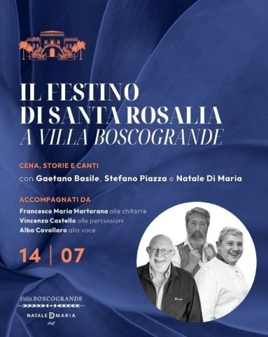 Gaetano Basile, giornalista e autore di testi teatrali, ma anche enogastronomo appassionato e narratore avvincente, da tre stagioni porta in scena a Villa Boscogrande insieme allo chef Natale Di Maria, il Pranzo Storico, un appuntamento che, una domenica al mese, analizza un periodo storico diverso della cucina siciliana lunga ben seimila anni, da quella di strada a quella della nobiltà siciliana. E sullo stesso mood è anche la proposta gastronomica del Festino che alternerà guastedde con milza, panelle e cazzilli, babbaluci a sucari e stigghiola a Sartù di riso ai frutti di mare e Tonno all’Archestrato di Gela. E per coinvolgere tutti i sensi, anche le musiche saranno ispirate alla tradizione popolare siciliana degli orbi e dei cantastorie, dal 1624 tratte dal Corpus di musica siciliana di Alberto Favara, dal repertorio di Elsa Guggino, Ignazio Buttita, Paolo Emilio Carapezza e le ricerche di etnomusicologia siciliana dell’americano Alan Lomax.