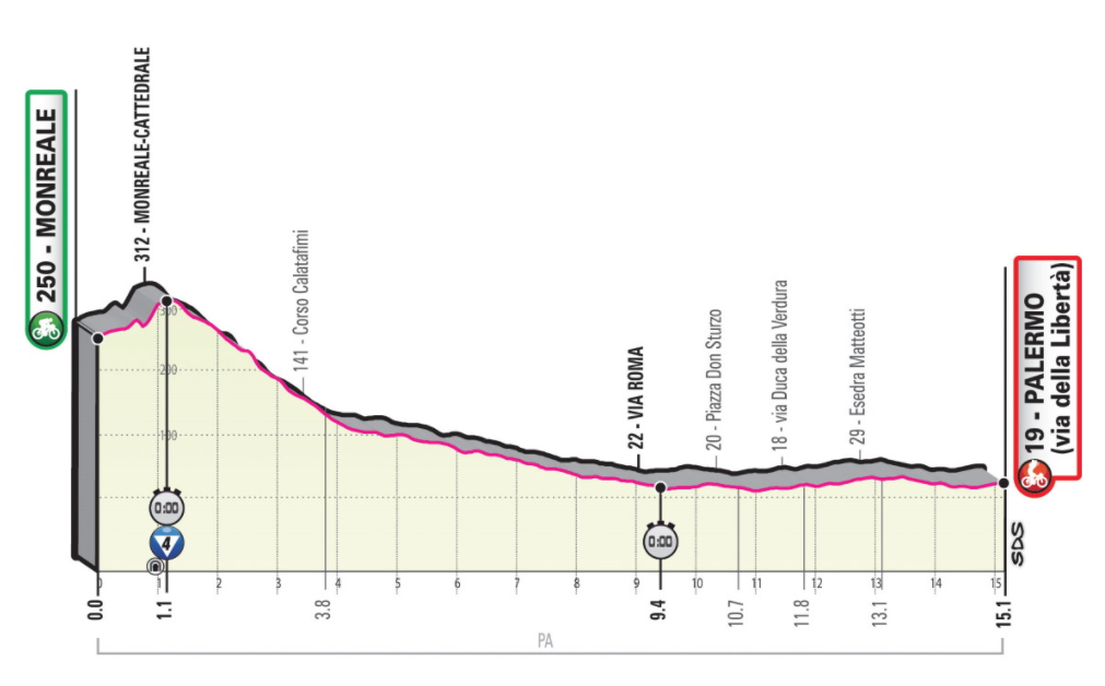 Si parte in via Ferrata a Monreale e il primo chilometro porterà i corridori alla Cattedrale dove si assegnerà il primo gran premio della Montagna della corsa. Poi la discesa e il tratto veloce: i corridori andranno “a tutta” prima sulla Provinciale 69 e poi lungo il rettilineo di Corso Calatafimi fino all’intertempo di Via Roma (oltre 5,5 km in cui i corridori attraverseranno anche Porta Nuova e corso Vittorio Emanuele).