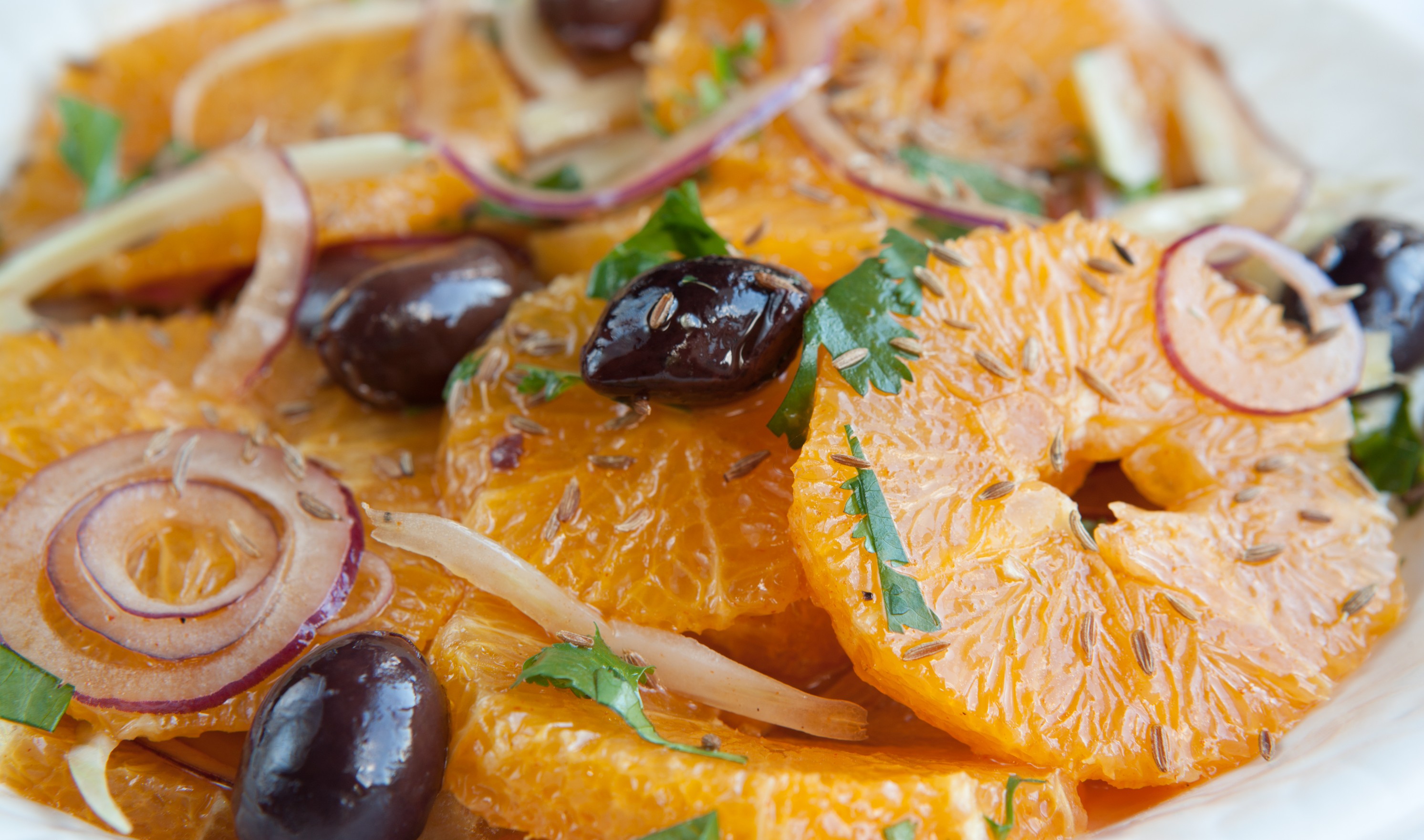 Per prima cosa pulite la cipolla rossa: dividetela a metà e rimuovete il germoglio verde al centro, se presente; tagliate la cipolla a julienne, poi immergetela in acqua fredda per almeno 10-15 minuti così da addolcirne il sapore. Nel frattempo pelate le arance: eliminate l’estremità superiore e inferiore dell’arancia, poi tagliate la buccia dall’alto verso il basso, facendo attenzione a rimuovere anche la parte bianca che ha un sapore amarognolo; separate i singoli spicchi. Infine prendete le olive nere e rimuovete il nocciolo utilizzando un denocciolatore, ma se non ce l’avete, procuratevi delle olive già denocciolate. Adesso è tutto pronto: potete passare al condimento. Versate l’olio extravergine di oliva in una ciotolina, aggiungete sale e pepe quanto bastano, ed emulsionate con una frusta a molla piatta o anche con una semplice forchetta. Poi, assemblate la vostra insalata: prendete una ciotola e aggiungete gli spicchi di arancia, la cipolla, ben scolata e asciugata, e le olive denocciolate; versate il condimento nella ciotola e mescolate bene. Guarnite il tutto con delle foglie di basilico e…buon pranzo!