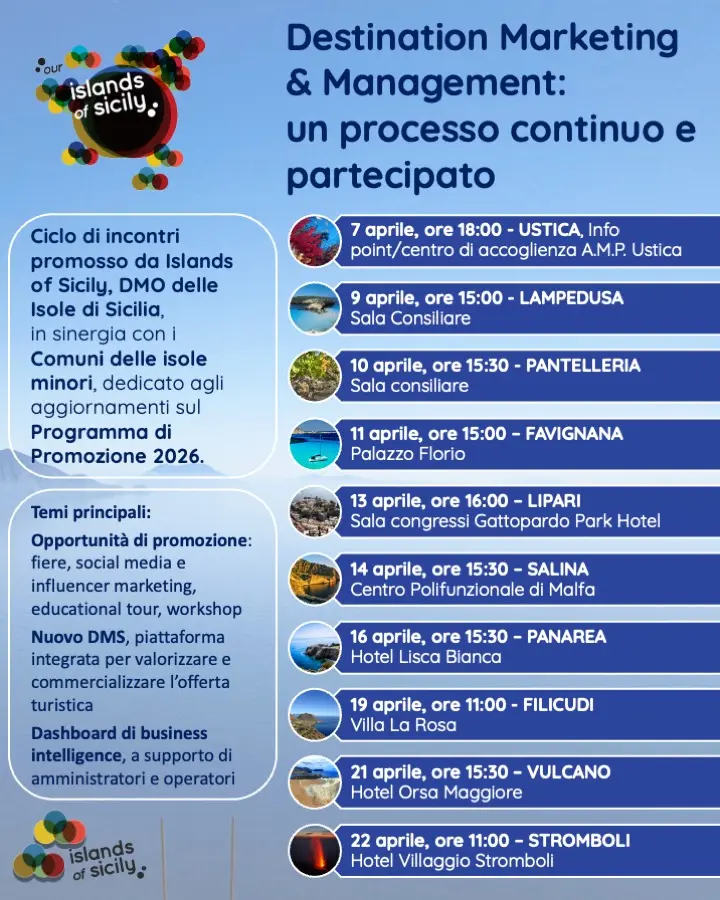 Si parte il 7 aprile da Ustica (ore 18:00, Info point / Centro di accoglienza A.M.P. Ustica), per poi proseguire con le tappe di Lampedusa, Pantelleria, Favignana, Lipari, Salina, Panarea, Filicudi, Vulcano e Stromboli. L’iniziativa si inserisce in un percorso condiviso di sviluppo e valorizzazione della destinazione, portato avanti con il coinvolgimento attivo delle amministrazioni comunali, degli operatori e del tessuto economico locale.