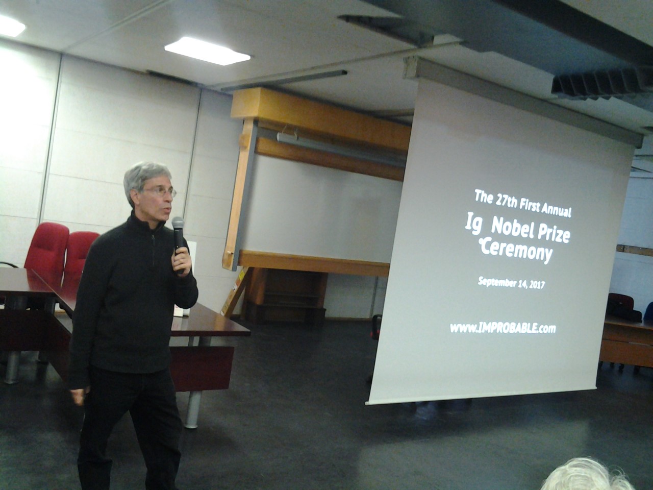 La spigliatissima Oberzaucher è stata una delle testimonial dell’Ig Nobel Spring Tour che per la prima volta ha fatto tappa in Italia, su invito del dipartimento di Fisica e Astronomia dell’Università di Catania. Gran cerimoniere dell’evento “Mr Ig Nobel” in persona, ossia Marc Abrahams, direttore della rivista statunitense Annals of Improbable Research e patron del premio che, senza mai lasciarsi sfuggire l’ombra di un sorriso durante il suo lungo talk, ha però animato e coinvolto il pubblico di curiosi presenti nell’aula “Ettore Majorana”, facendo talvolta sperimentare a loro stessi i risultati di queste ricerche.