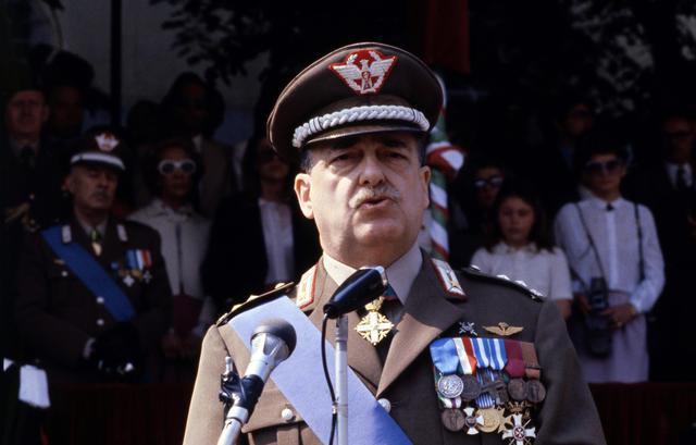 Il generale della prima divisione Pastrengo Carlo Alberto Dalla Chiesa durante la cerimonia dell'anniversario dell'Arma dei carabinieri nella caserma Medici a Milano il 5 giugno 1981. ANSA / ARCHIVIO STORICO