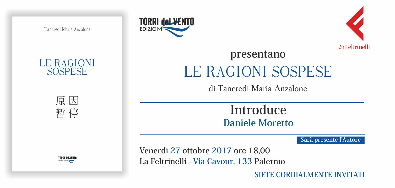 Venerdì 27 ottobre alle ore 18:00 verrà presentato Le ragioni sospese edito da Torri del Vento di Tancredi Maria Anzalone presso La Feltrinelli di Palermo.