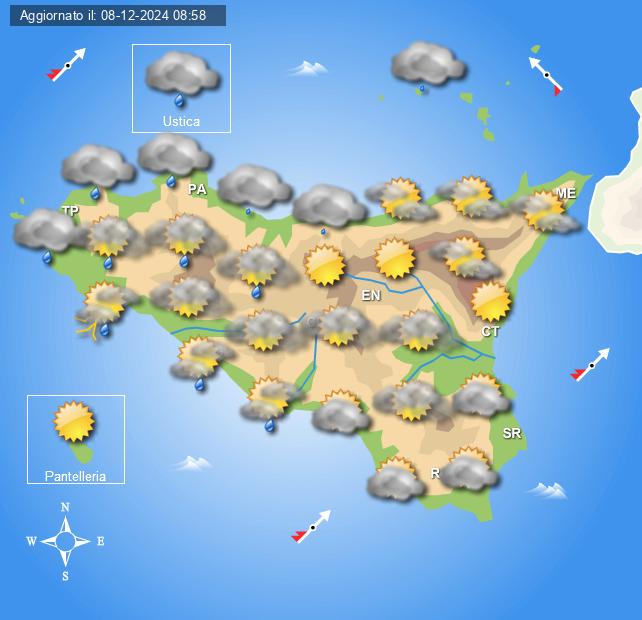 Nuvolosità in transito al mattino e al pomeriggio sulle zone occidentali della regione con possibilità di piogge sparse, maggiori schiarite altrove. In serata e nottata ancora fenomeni possibili sui settori settentrionali dell’Isola.