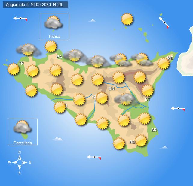 Sabato. Giornata all’insegna del tempo stabile con cieli sereni o poco nuvolosi sia al mattino che al pomeriggio. Nessuna variazione nelle ore serali e notturne salvo qualche addensamento in arrivo sui settori occidentali dell’Isola.