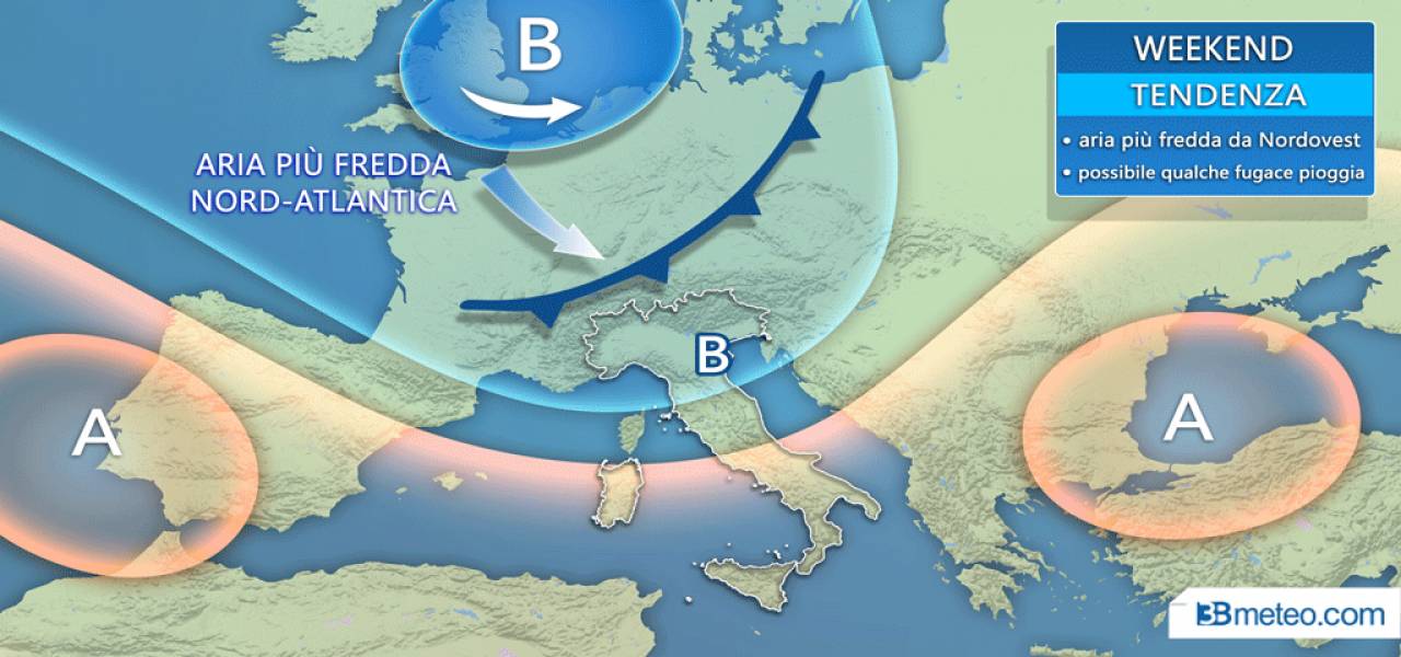 Meteo weekend: torna il maltempo. “Giungono ulteriori conferme sull’arrivo di una perturbazione atlantica che nel fine settimana spazzerà via l’anticiclone” – lo conferma il meteorologo di 3bmeteo.com Edoardo Ferrara, che spiega: “fino a venerdì poche novità con tempo stabile ma anche nebbie, nubi basse e smog soprattutto al Nord e versanti tirrenici”.