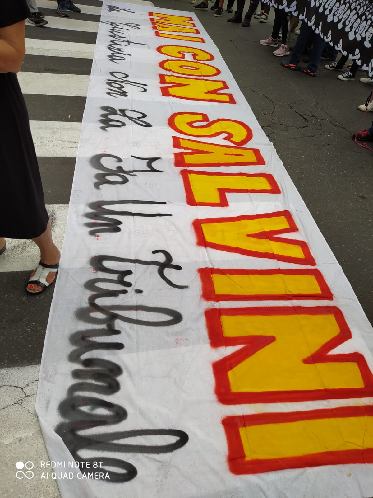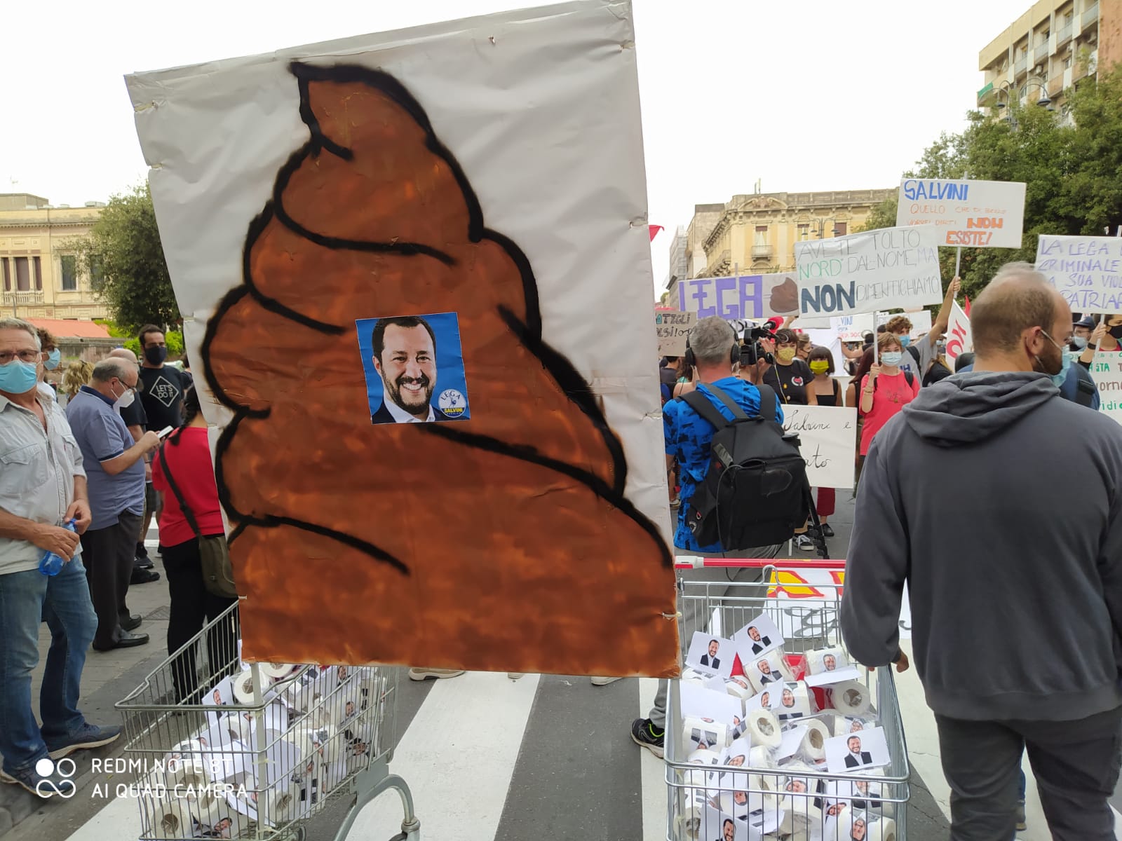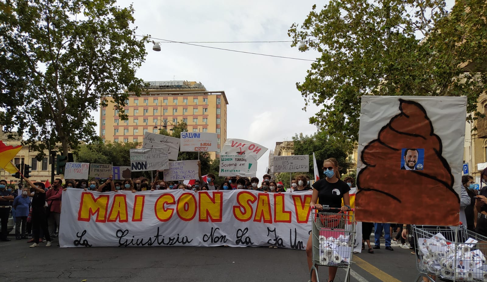 Radunati in piazza Trento, le oltre mille persone scese in piazza hanno sin da subito lanciato un messaggio chiaro, scritto anche nello striscione: “la giustizia non la fa un tribunale” e, a capeggiare sul furgoncino in testa alla manifestazione: “abbiamo già la sentenza: Salvini merda”.