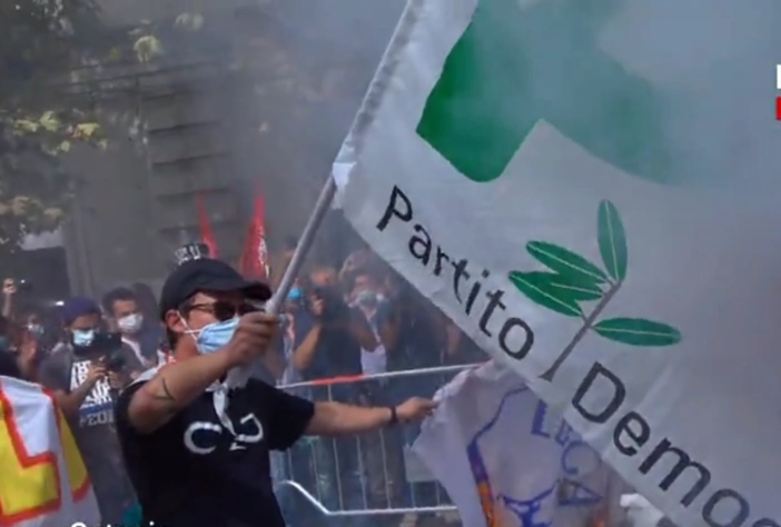 Proprio oltre cento rotoli con la faccia di Salvini sono poi stati lanciati aldilà del dispiegamento di polizia, in piazza Verga.