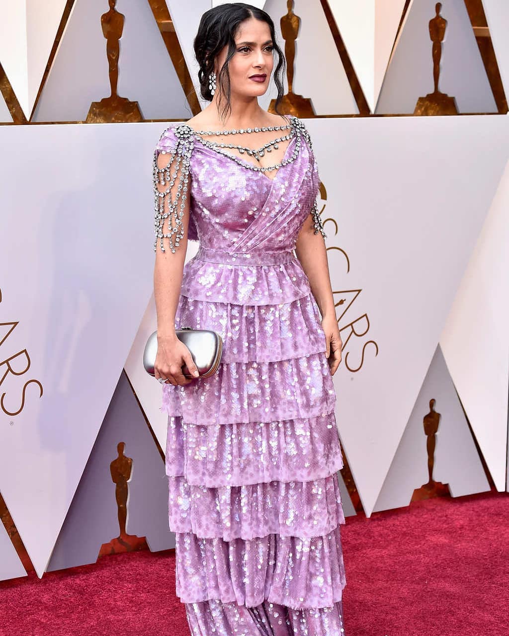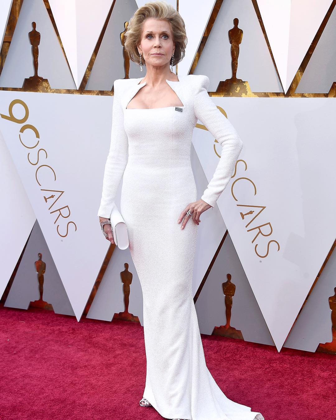 Jane Fonda ha scelto il bianco. l’attrice ha consegnato quest’anno il premio al miglior attore. L’ultra violet, che è il colore pantone del 2018, è scelto da molte delle attrici come Ashley Judd, ad esempio. Oppure in sfumature meno accese, come il glicine di Salma Hayek. Ma non mancano neanche il verde e l’indaco, come quello dell’abito di Helen Mirren.