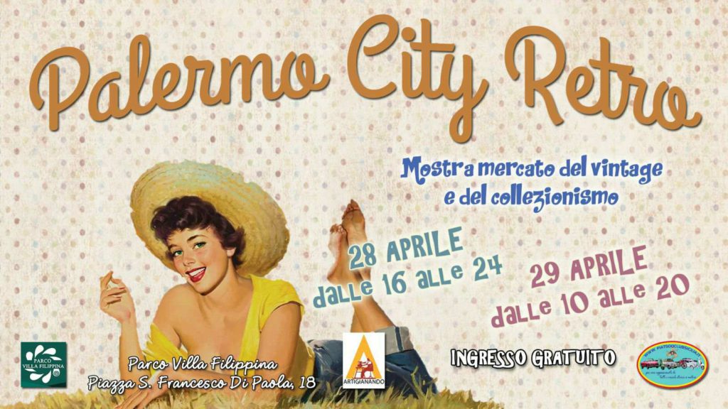 Palermo City Retrò. Due giorni dedicati al vintage e al collezionismo. Sabato 28, dalle 16 alle 24, e Domenica 29 Aprile, dalle 10 alle 20, sotto i portici settecenteschi di Parco Villa Filippina (Piazza San Francesco di Paola, 18. Ingresso libero) si svolgerà la nuova edizione della mostra mercato Palermo City Retrò www.facebook.com/PALERMOCITYRETRO), la fiera espositiva interamente dedicata agli amanti del vintage e del collezionismo divenuta ormai uno degli appuntamenti più attesi.