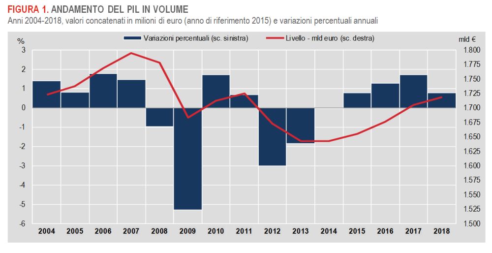 ROMA (ITALPRESS) – Nel 2018 il Pil ai prezzi di mercato e’ pari a 1.765.421 milioni, con un incremento dell’1,7% rispetto all’anno precedente. Il Pil in volume e’ aumentato dello 0,8%, con una revisione al ribasso di 0,1 punti percentuali rispetto alla stima di aprile. Cosi’ l’Istat che ha diffuso la revisione generale quinquennale dei conti economici nazionali. La crescita del Pil e’ stata accompagnata da un incremento del 3% in volume delle importazioni di beni e servizi; nel complesso, le risorse disponibili sono cresciute dell’1,3%. Nel 2018 la spesa per consumi finali delle famiglie residenti e’ aumentata, in volume, dello 0,8%. Nell’ambito dei consumi finali interni, sia la componente dei servizi sia quella dei beni sono cresciute dello 0,9%. Gli investimenti fissi lordi segnano un aumento, in volume, del 3,2%. In termini di contributi alla crescita del Pil la domanda nazionale al netto delle scorte ha fornito un apporto positivo di 1,1 punti percentuali (di cui 0,5 punti attribuibili ai consumi finali nazionali e 0,6 punti agli investimenti fissi lordi e oggetti di valore), la componente estera ha contribuito negativamente per 0,3 punti, mentre le scorte hanno sottratto 0,1 punti percentuali.