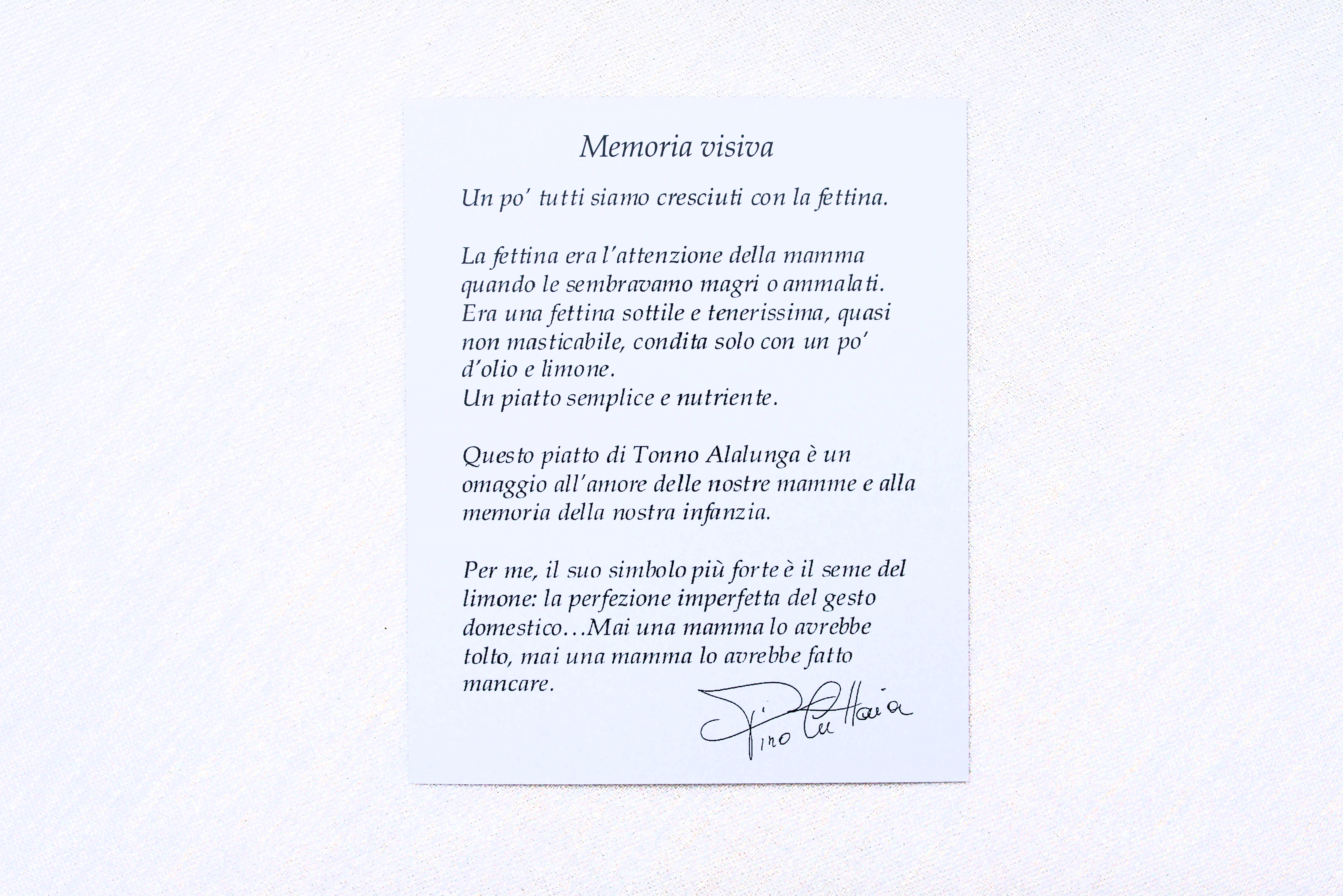 «Credo che un cuoco debba essere il custode dei gesti domestici che si imparano in famiglia da piccoli. Oggi si è sempre di corsa e nessuno ha più il tempo di tramandare le tradizioni di madre in figlio e questo oggi è il compito di uno Chef. Io quindi mi lascio ispirare dai ricordi che cerco di evocare e la mia tavola diventa il luogo della memoria».