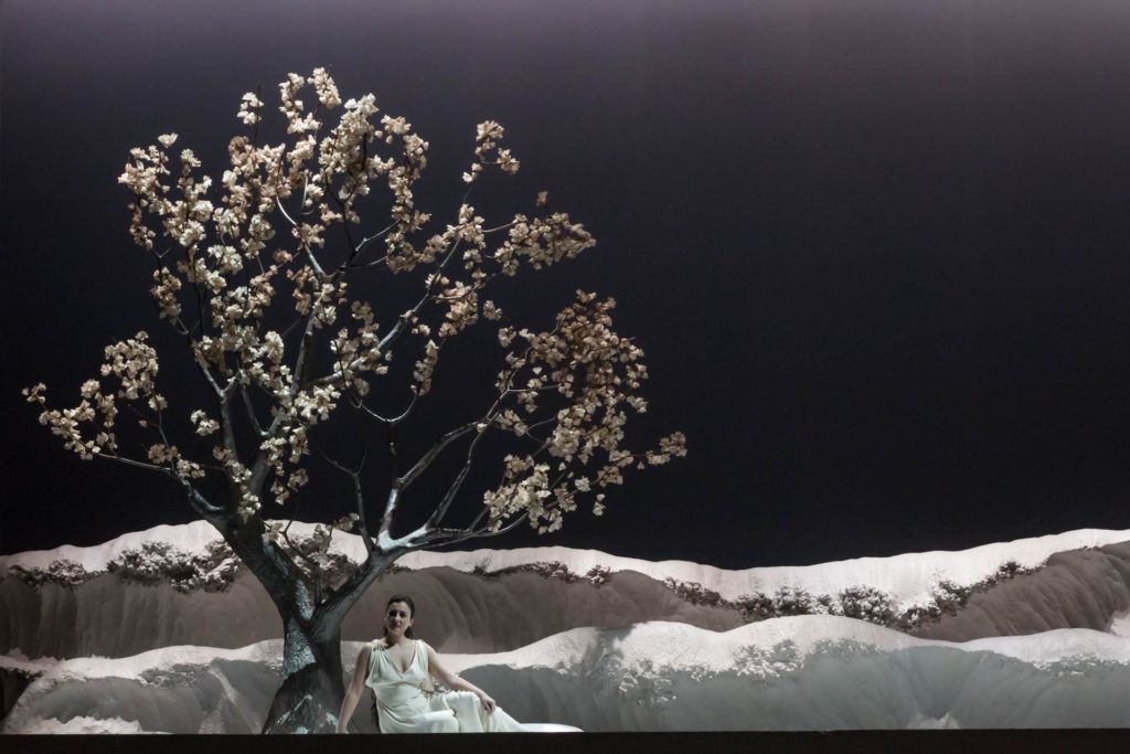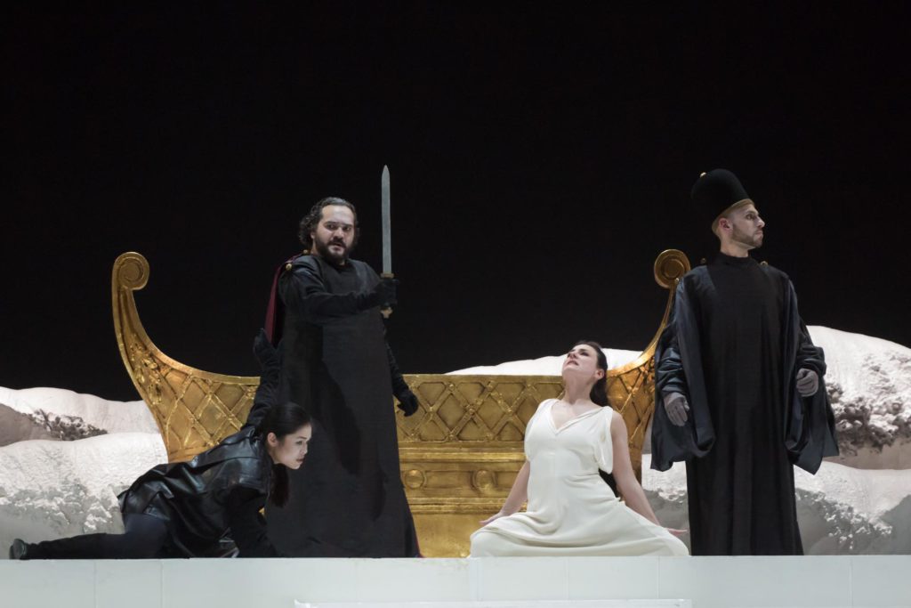 Prima di Idomeneo, l bianco della scena fa risaltare i costumi inizialmente neri e poi man mano binchi