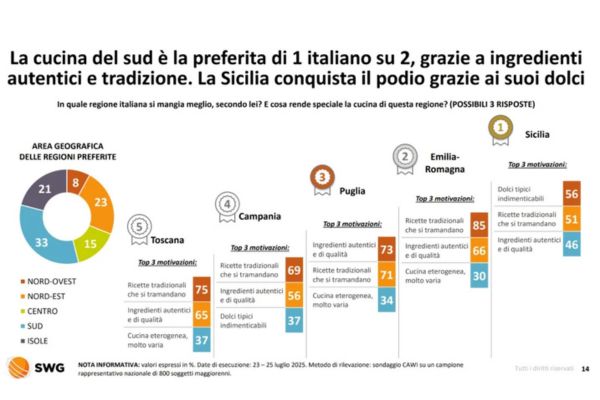 Quando si parla di cucina invece, il Sud Italia si distingue nettamente come vincitore: un italiano su due premia le regioni meridionali per la forza della tradizione gastronomica e l’uso di ingredienti autentici. La Sicilia svetta su tutte, grazie a una cucina identitaria e ricca, impreziosita da una pasticceria considerata unica nel panorama nazionale. E’ quanto emerge da un sondaggio Radar Swg. La Sicilia conquista il podio grazie ai suoi dolci, alle ricette tradizionali che si tramandano e agli ingredienti autentici e di qualità.
