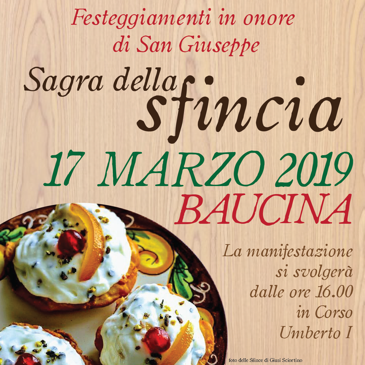 Sagra della sfincia a Baucina. Domenica 17 marzo Baucina si veste a festa e in occasione dei festeggiamenti di San Giuseppe offre agli ospiti che la raggiungeranno l’occasione per immergersi nelle tradizioni popolari siciliane, per gustare cibo di qualità e per godersi una giornata primaverile in collina in un centro a 40 minuti da Palermo.