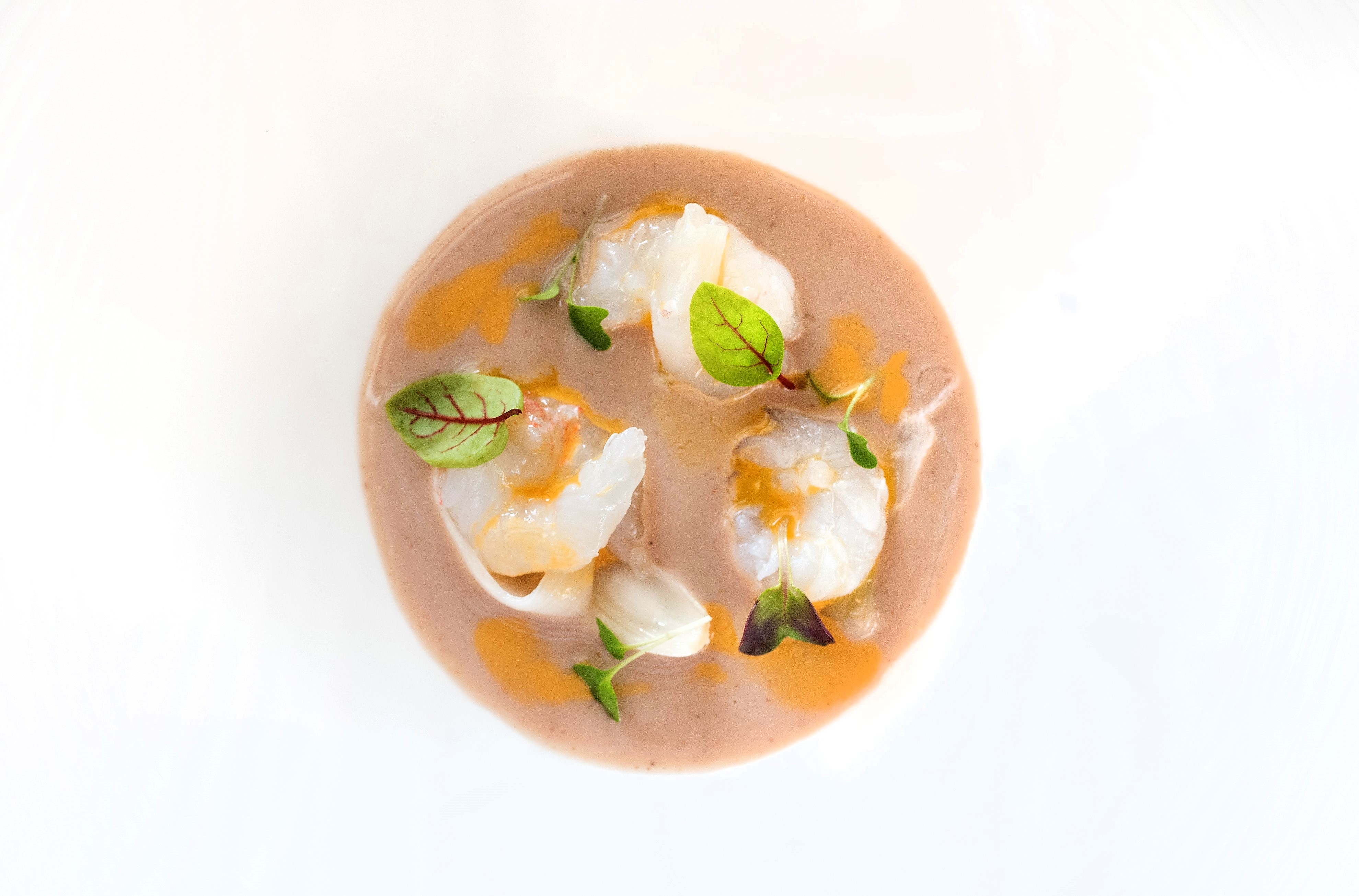 Sgusciare gli scampi e preparare la bisque utilizzando i carapaci e le teste: soffriggere in pentola con olio extra vergine di oliva. Successivamente aggiungere carota, sedano e cipolla e far cuocere aggiungendo del pomodoro tagliato a metà; coprire con ghiaccio e acqua. Lasciar cuocere per circa un’ora e al termine della cottura battere con la frusta il tutto e filtrare con chinoise.