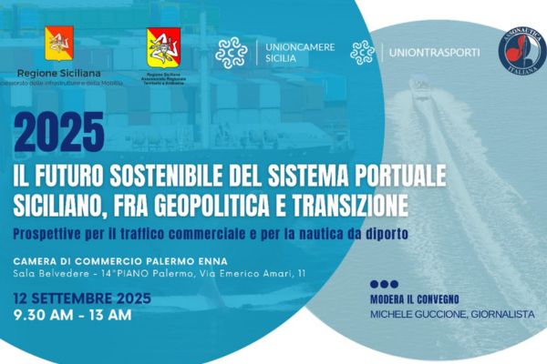 Appuntamento venerdì 12 settembre, alle ore 9,30, presso la Sala Belvedere al 14esimo piano della Camera di commercio Palermo Enna, in via Emerico Amari, 11, a Palermo, con l’evento “Il futuro sostenibile del sistema portuale siciliano, fra geopolitica e transizione”, organizzato da Unioncamere Sicilia, Uniontrasporti e Assonautica nell’ambito del Programma Infrastrutture finanziato dal Fondo perequativo 2023-2024 di Unioncamere nazionale.